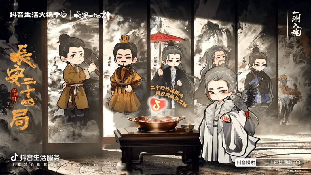 更进一步,活动还借势热门影视IP《长安二十四计》,联动沙胆彪、呷哺呷哺、朱光玉等24家火锅品牌推出联名产品。这不仅在社交平台引发了大规模“自来水传播”,更通过“联名品+直播”的整合营销,在活动期间创造了可观的销售转化。实现了平台流量转化、商家营收提升和文化IP破圈传播的三方共赢。
